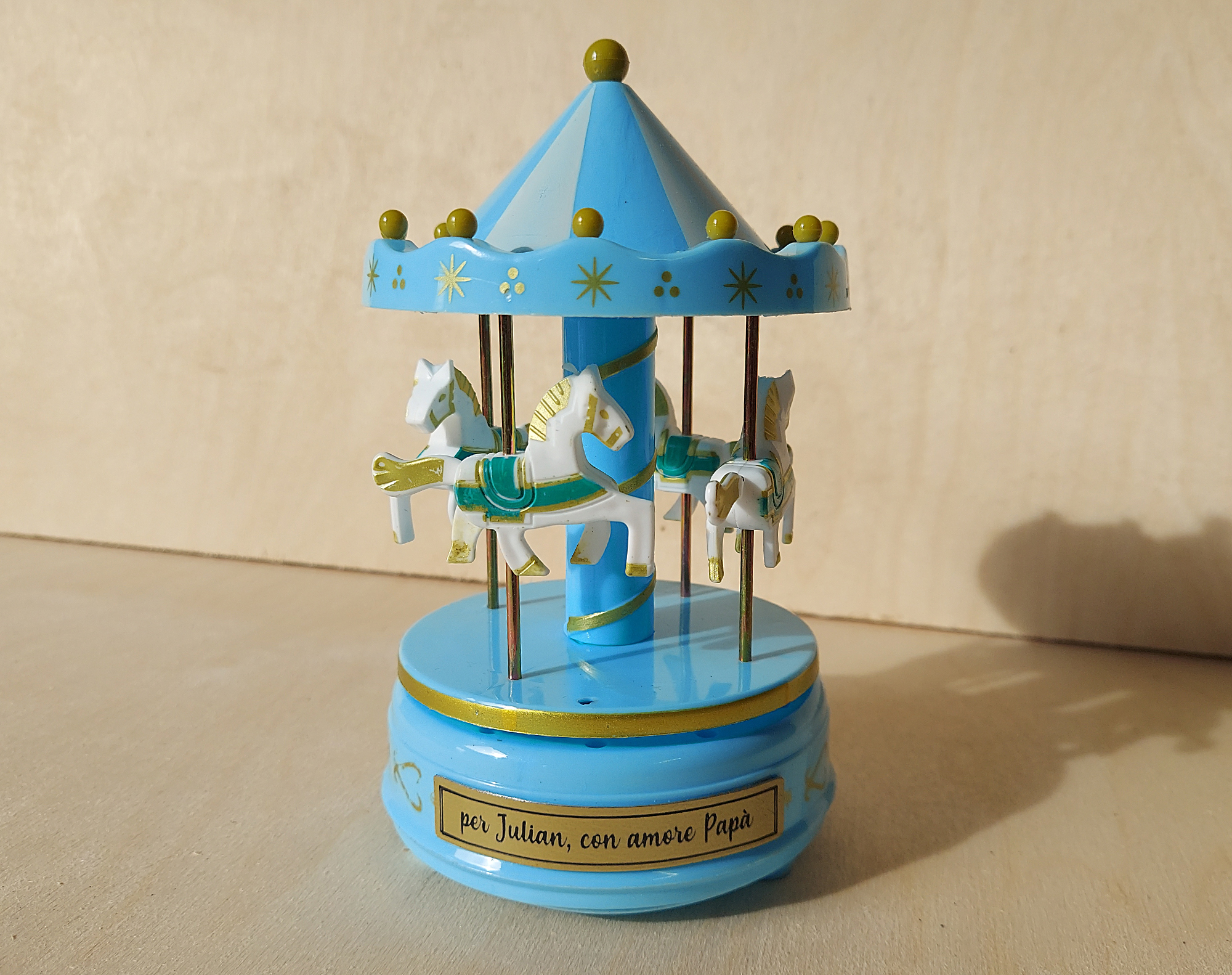 Personalisiertes Karussell-Mobile in Hellblau mit Pferdewagen