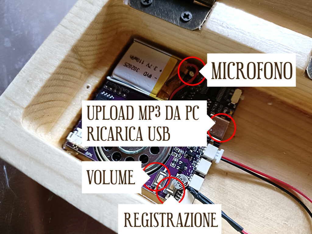Registration and recharging of the music box with recordable and customizable melody They're very simple: just remove the internal cover by unscrewing two screws. You can upload your MP3 file from your PC via USB or record any audio source using the built-in microphone.