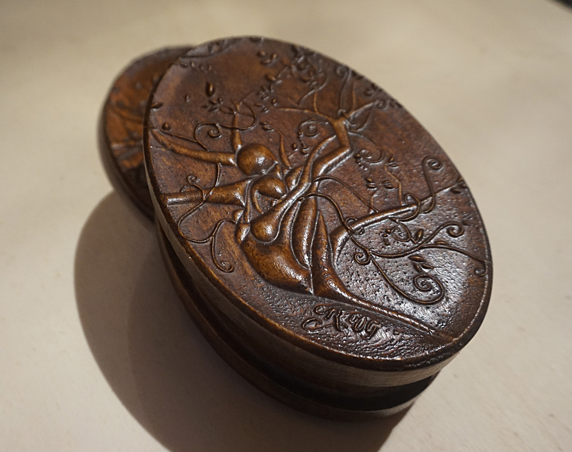 Caixa oval com desenho personalizado feita para Roberta de GênovaRoberta nos pediu para transformar seu desenho a lápis em uma escultura de madeira em relevo para ser criada na tampa da caixa.