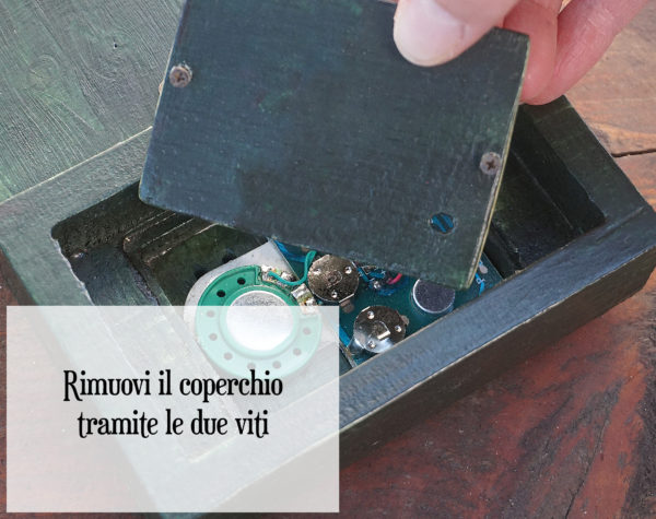 Registro e substituição da bateria caixa de música com melodia gravável e personalizável São muito simples: basta remover a tampa interna desaparafusando dois parafusos. O mecanismo foi projetado para garantir praticidade e durabilidade ao longo do tempo.